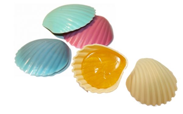 - Hartkaramelle zum Lutschen in einer Plastikmuschel