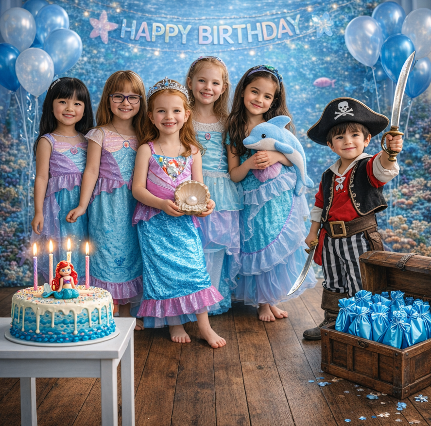Diese Partykiste ist rand voll gepackt mit tollen Accessoires für einen unvergesslichen Meerjungfrauen-Kindergeburtstag!